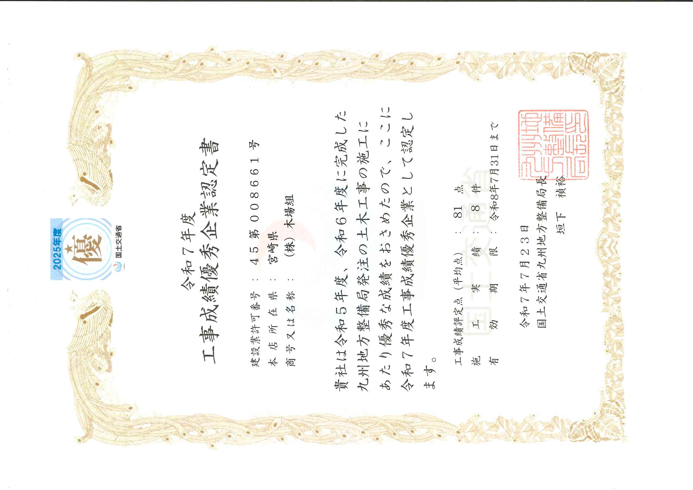 令和7年度の国土交通省九州地方整備局工事成績優秀企業認定を受けました。